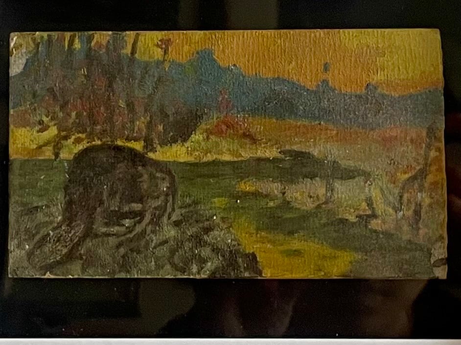 The artist uses a muted earthy palette of olive green, brown, grey-blue, and ochre, with touches of amber in the sky that suggest dusk light. Brushwork is loose and somewhat rugged, rendering a compact tonal landscape study..