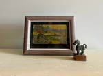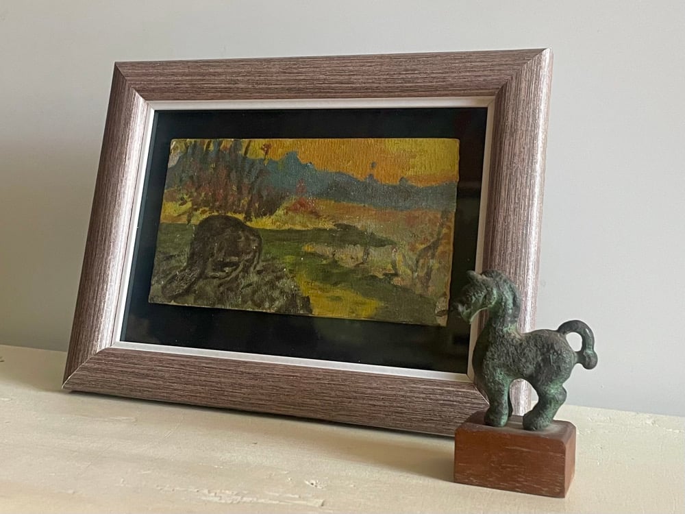 Charming oil landscape housed in a contemporary frame, moody and expressive character. A dark, rounded tree stump anchors the left foreground, set against marshy ground and a quiet stretch of water that leads the eye into the distance. Beyond it, low hills and a band of warm sky create a simple but evocative horizon.