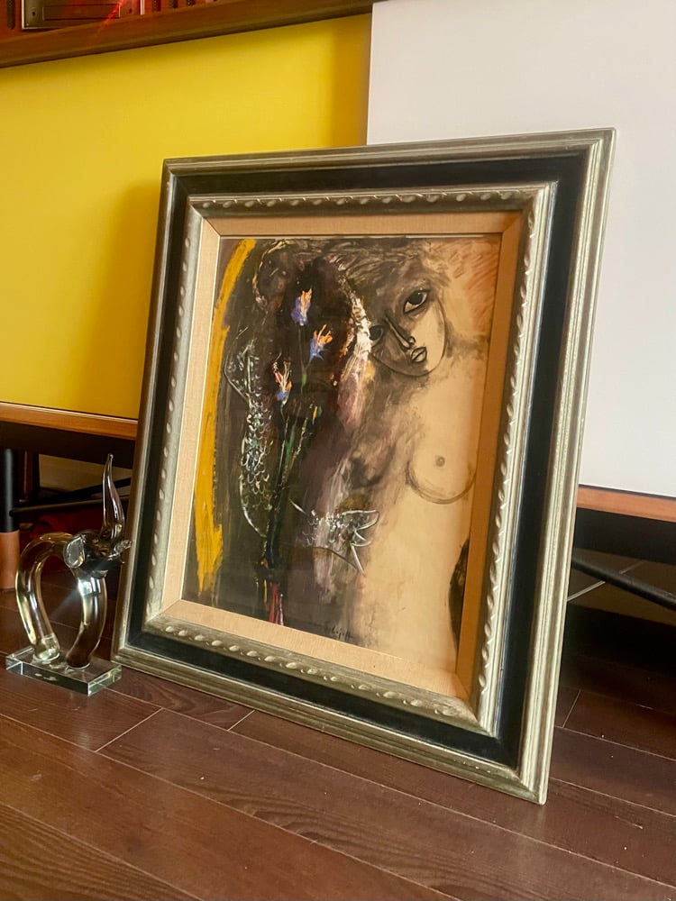 Evocative mixed-media work on paper, titled lower center, layering myth, desire and dreamlike ambiguity. In the foreground, a vertical spray of vibrant flowers, painted in electric blues, fiery oranges, and soft pink, anchors the composition. Their sharp, luminous petals feel almost phosphorescent, as though lit from within. Behind them, a mermaid figure materializes. Her shimmering tail arcs upward. To the right, a spectral female torso and face emerge from a pale, softly rendered field, her large, liquid eyes and delicate features conveying a quiet, enigmatic yearning. She appears neither fully present nor submerged, caught in a liminal space between worlds.