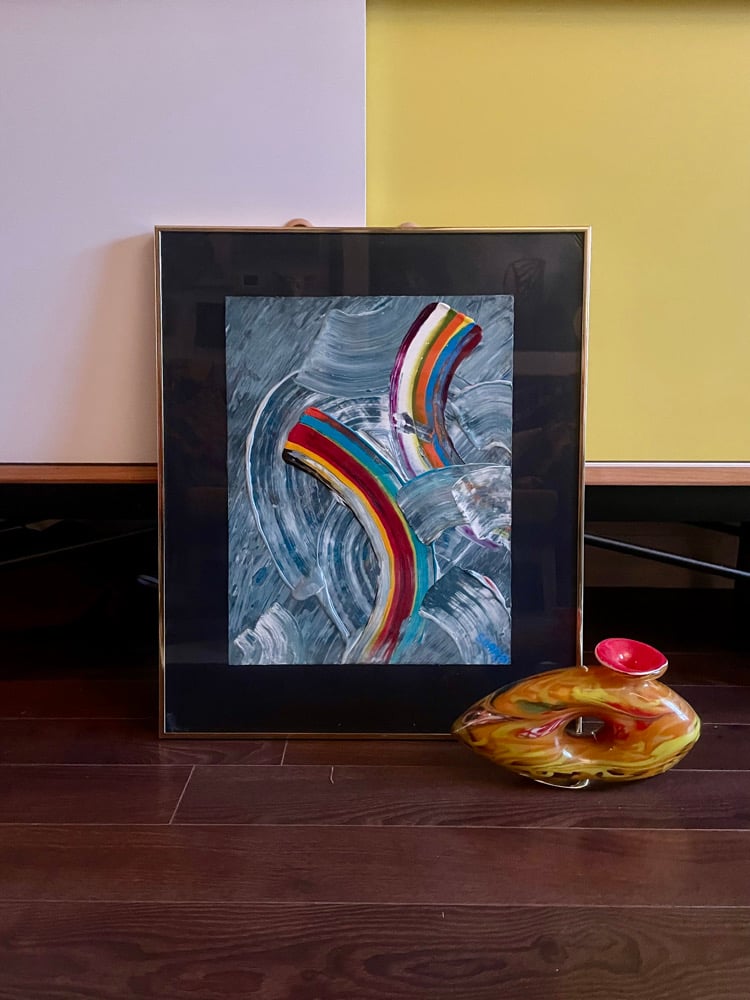Energetic oil abstract on paper, signed and dated 81 lower right, titled “Float Free” verso. It is animated by two bold, ribbon-like arcs of saturated color that sweep across a stormy field of grey, white, and blue-green. Bands of crimson, turquoise, orange, yellow, violet, and white cut through the surface with a sense of motion and lift, while broad, muscular swaths of paint curve and churn around them like wind, surf, or smoke. The contrast between the thick, luminous stripes and the muted, turbulent ground creates a dynamic tension between structure and spontaneity. Gestural and highly physical, the painting feels both celebratory and unsettled, as though bright currents of energy are pushing through a shifting atmosphere. Wonderful..