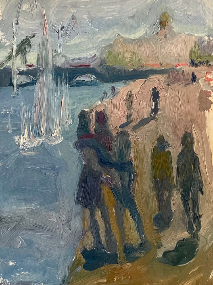 Lovely oil on board study, signed and dated 2015 verso, capturing a fleeting riverside moment with expressive, almost impressionistic brushwork. In the foreground, loosely defined figures gather along a sunlit path beside a body of water. The figures are rendered with thick, textured strokes — deep violets, ochres, and muted blues — which blur their outlines. To the left, the shimmering surface of the water dominates, with lively vertical strokes that evoke the spray of a fountain. Across the background, faint architectural shapes and a bridge emerge from cool blue and lavender tones.