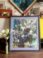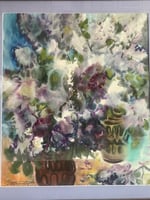 Lush, atmospheric watercolour on paper, signed lower left, depicting an abundant floral arrangement in a patterned vase, dissolved into layers of soft color and fluid gesture. Blooms in deep plum, mauve, violet, cream, and touches of green seem to emerge and recede through misty washes, giving the bouquet a dreamlike, almost improvisational presence. Petals, leaves, and shadows blur into one another, creating movement and depth through transparency, bleeding edges, and rich tonal pooling. Hints of a tabletop and a second decorative vessel anchor the composition, but the painting remains more evocative than descriptive. Romantic and expressive, with a beautiful balance between control and spontaneity. It feels vibrant yet soft, as though light, moisture, and blossom have all been captured in the same breath.