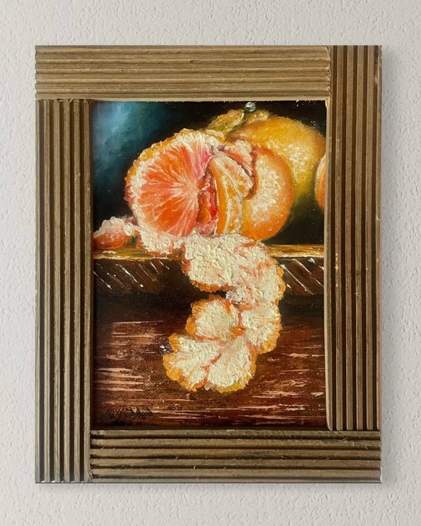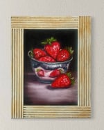 This pair of small oil still lifes brings together two classic studies in colour, texture, and light. On the left, a peeled orange rests on a wooden surface, its glowing flesh and cascading rind painted with warm, tactile richness against a dark ground. On the right, a bowl of strawberries and a single berry in the foreground are rendered in vivid reds, their glossy surfaces set off by deep shadow and soft reflected light. Together, the paintings create a pleasing dialogue between citrus and berry tones, balancing freshness, intimacy, and quiet abundance.