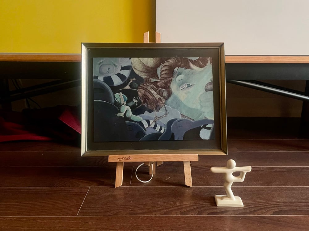 Surreal drawing titled “A Friend Is a Present You Give to Yourself” verso, framed under anti glare glass, unfolding as a surreal, dream-like tableau rendered in deep blue-green tones, drifting between tenderness and unease.