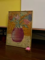 Wonderful mixed media drawing on paper, unsigned, presenting a softly abstracted still life of flowers in a rounded magenta vase. The artist employs layered textures and a subdued yet warm palette—ochres, mauves, teal greens, and dusty reds—to create a sense of both depth and intimacy. The forms of the flowers are loosely defined with expressive, gestural strokes..