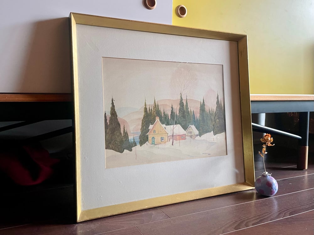 The composition balances stillness and warmth: the open foreground of untouched snow gives the scene a hushed, expansive calm, while the cottages introduce a sense of shelter and human presence. The artist uses transparent washes and restrained detail to capture the clarity of winter light, allowing the paper itself to convey the brightness of the snow. Elegant and serene - a cold but radiant day in the Quebec countryside!